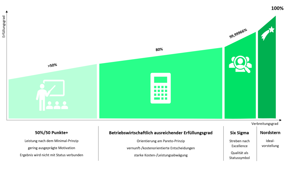 Pauschal lässt sich das nicht beantworten, auch wenn in vielen Lehrbüchern von einer „angemessenen“ Qualität doziert wird. Je nach Anspruch des Unternehmens, oder des Einzelnen an sich selbst, ist zunächst die Frage zu beantworten: Was will ich sein? Kosten- oder Leistungsführer. Daran orientiert sich dann auch der anzustrebende Qualitäts-Erfüllungsgrad, welcher dann irgendwo zwischen „betriebswirtschaftlich ausreichend“ und „Six Sigma“-Niveau liegen dürfte.