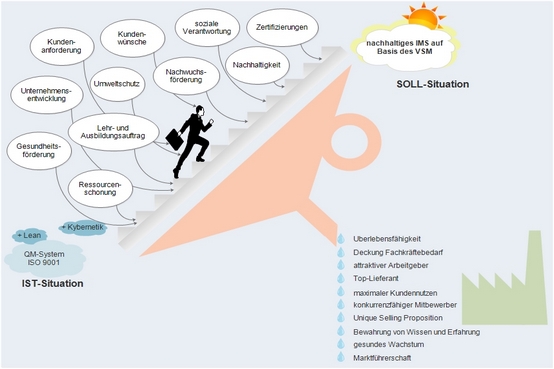 Wichtigste Schlagworte sind also aus Sicht des Unternehmens รberlebensfรคhigkeit und Strategieeinbindung, aus der Mitarbeiterperspektive Aufgabenautonomie und Selbstorganisation, so weit dies bei einem Lohnfertiger mรถglich ist.