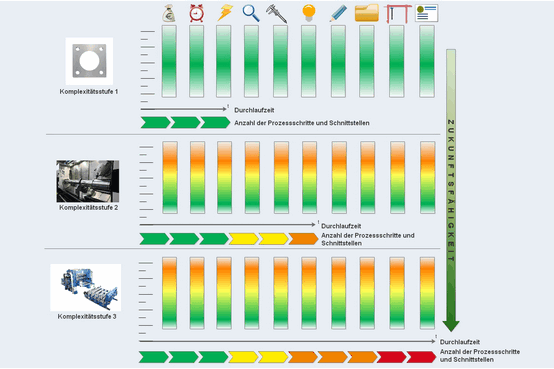 Analog zur jeweiligen Komplexitรคtsstufe wird der zugehรถrige Produktionsprozess entweder in der einfachsten, oder der Maximalausprรคgung abgearbeitet. Hier macht sich die Integration der Anforderungen aus verschiedenen Anforderungsquellen (siehe IMS) bezahlt – wirtschaftliche Prozesse und die passende Zuordnung zu den Fรคhigkeiten der Mitarbeiter werden sichergestellt.